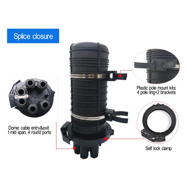 GJS-M5-JFT optical fiber splice closure is a dome type enclosure, which is used for the direct connection during optical fiber transmission, and provides joint connection protection, with 4 round cable inlet holes and 1 elliptical cable inlet hole; it adopts mechanical seal; it can be used for overhead, pole mounting, wall mounting and buried installation; good sealing performance, simple installation and wide application range.